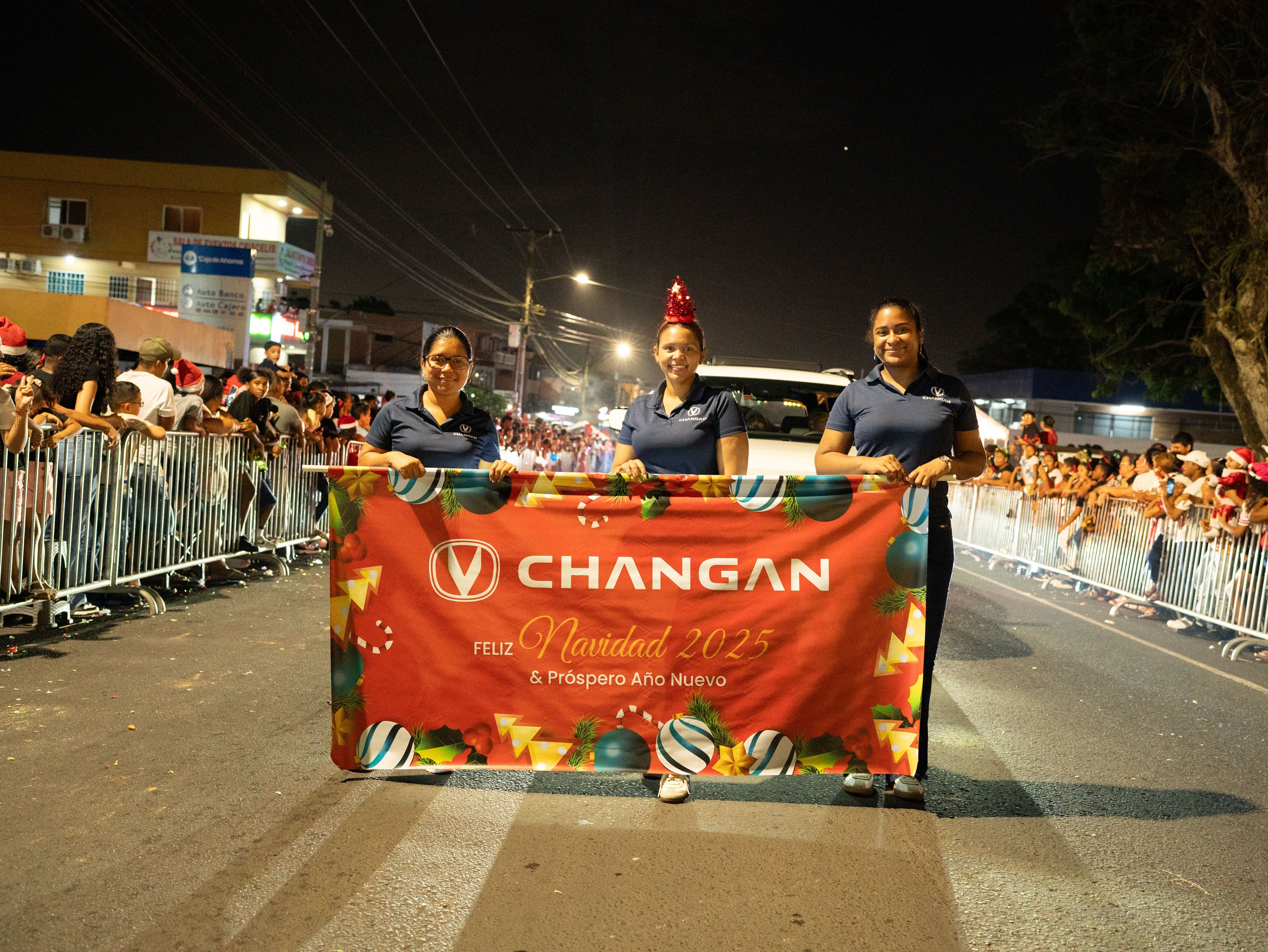 Durante el recorrido del desfile, Changan dijo presente con una participación cercana y dinámica, compartiendo con los asistentes y sumándose a una de las actividades más esperadas de la temporada navideña en La Chorrera.